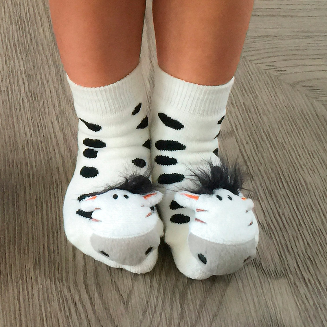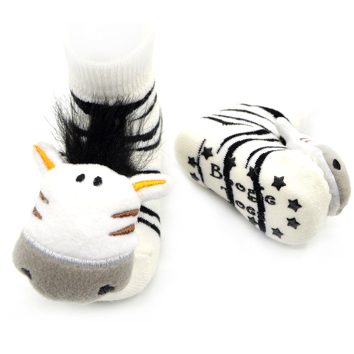 Black and white is always in style - especially when it's on a zebra! These cuties have the sweetest faces and little tufts of black mane hair, with stripes that go all the way up the sock and rubber grip-bottoms to provide traction for new walkers. The friendly stuffed zebra faces double as rattles!